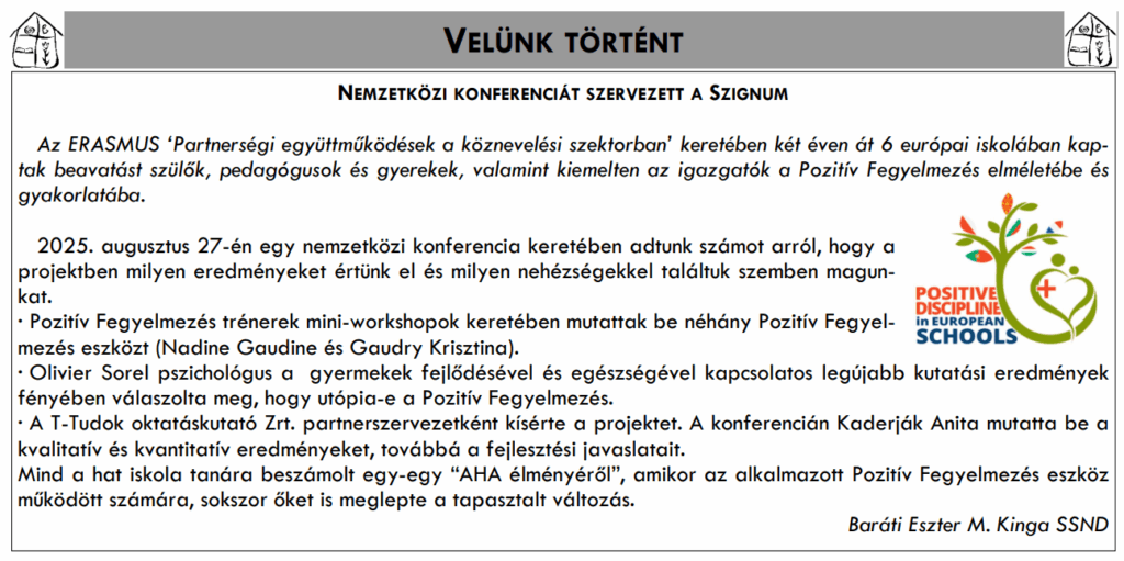 Az ERASMUS ‘Partnerségi együttműködések a köznevelési szektorban’ keretében két éven át 6 európai iskolában kaptak beavatást szülők, pedagógusok és gyerekek, valamint kiemelten az igazgatók a Pozitív Fegyelmezés elméletébe és